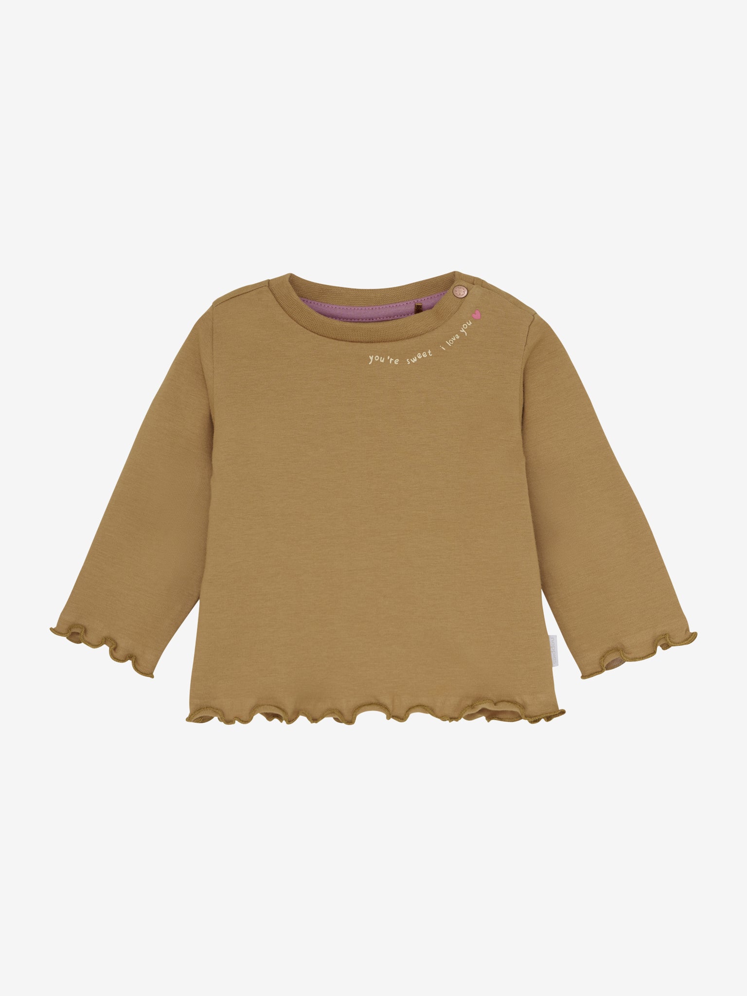 Meisjes longsleeve Tacony van Noppies Baby, gemaakt van GOTS-gecertificeerd katoen (CU1392474), in een jerseykwaliteit. Het artikel heeft een effen kleur. De longsleeve heeft een ronde hals met drukknoop en lange mouwen.